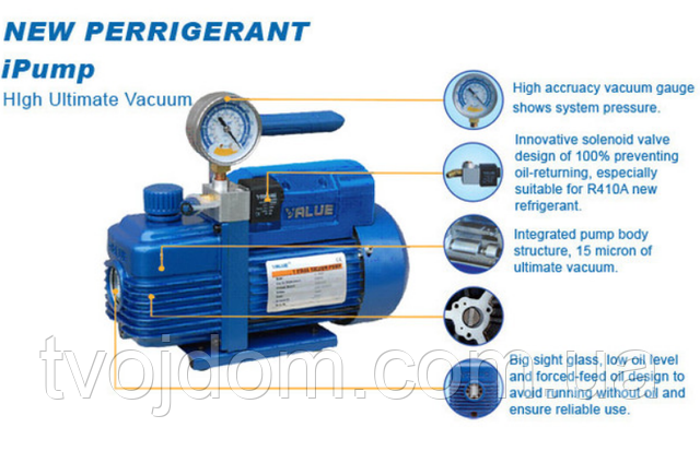 Вакуумний насос можна купити будь-який із серії VE, вакуумні помпи для кондиціонерів. Вхід насосів VE пасує за різьбленням стандартного тройника (вакуумного коллектора).